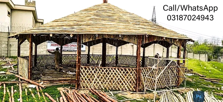 بانس ڈیزائن پاکستان کام کر رہی ہے اسلام اباد میں۔وہاں پر ایک بہت ہی خوبصورت جھونپڑی/ ہٹ تیار کیا جا رہا ہے یہ ہٹ ڈبل بانس کے پیلنگ میں تیار ہو رہا ہے اس ہٹ کے نیچے چاروں سائیڈ پر بانس کے گرل لگائی جا رہی ہے جو جھونپری کو ایک نئی لک فراہم کرتا ہے یہ جھونپڑی 20 /20 کے سائز میں تیار ہو رہی ہے اگر اپ نے اس طرح کی جھونپڑی ہم سے بنوانی ہے تو ہمارے نیچے دے گئے لنک پر کنٹیکٹ کریں شکریہ